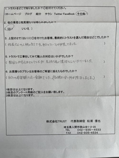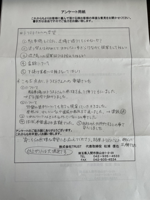 この度は、数ある業者の中で弊社を選んで頂きありがとうございました。 一番お悩みされていた色分けの部分なども、バランスが良く仕上がり良かったです。お打合せも楽しくさせて頂きました。 また一年点検でお伺いさせて頂きます。 有難うございました。 |
