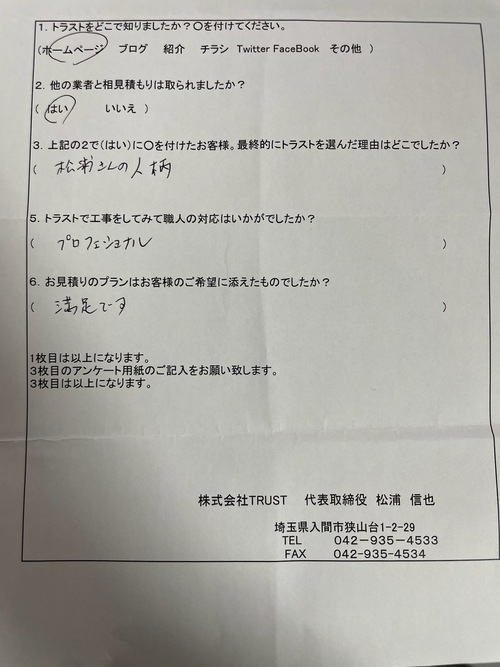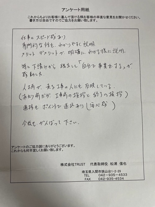 この度は数ある業者の中から弊社を選んで頂き有り難う御座います。 作業中はたくさんのお気遣いをして頂き有り難う御座いました。 お陰様で作業もスムーズに終える事が出来ました! 完工後もお褒めのお言葉をたくさん頂けて、もっと頑張ろうと思えました! 貴重なご意見有り難う御座いました。 今後とも弊社TRUSTを宜しくお願い致します。 また、一年点検でお伺いさせて頂きます。 |