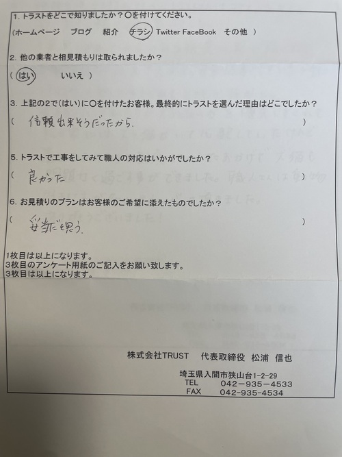 この度は数ある業者の中から弊社を選んで頂き有り難う御座います。 作業中はたくさんのお気遣いをして頂き有り難う御座いました。 お陰様で作業もスムーズに終える事が出来ました! アンケートでお褒めのお言葉、大変嬉しいです! 外壁色なども悩んで頂き、僕も打ち合わせも楽しくさせて頂けました! 貴重なご意見有り難う御座いました。 今後とも弊社TRUSTを宜しくお願い致します。 また、一年点検でお伺いさせて頂きます。