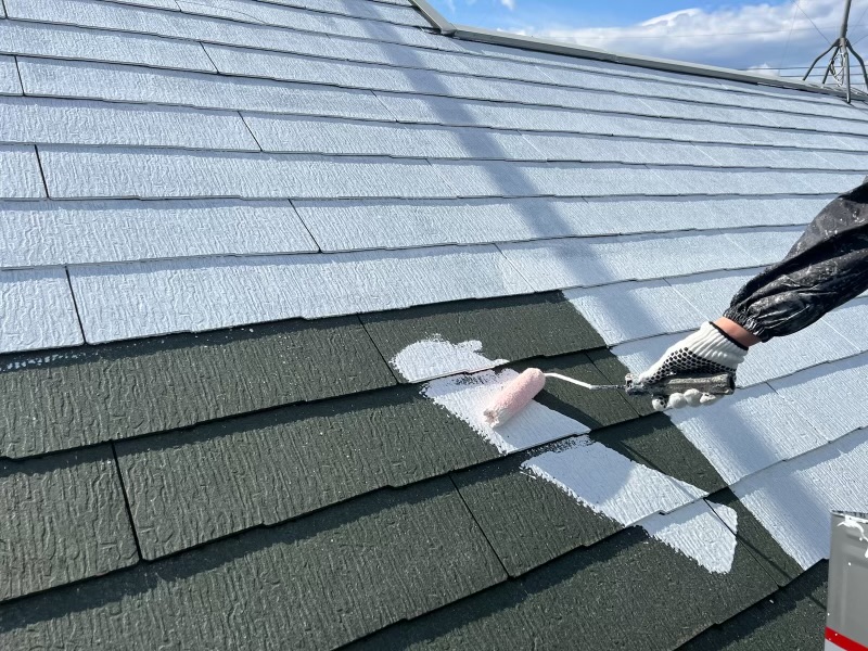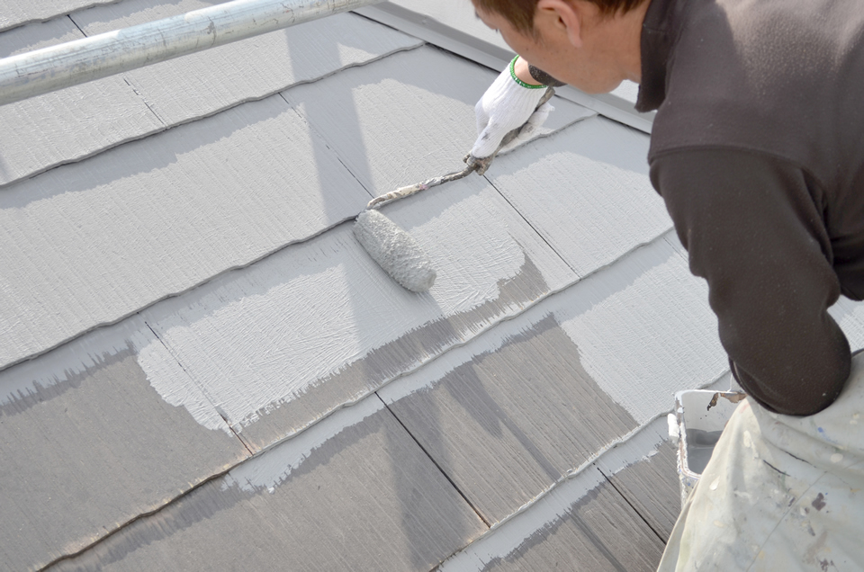 POINT07 上塗り 上塗り材を塗ることにより、防水や紫外線保護の機能を屋根に付けることができます。近年では、熱反射材の高い上塗り材を使用することにより、耐久性を上げる付加価値の大きい塗料もあります。