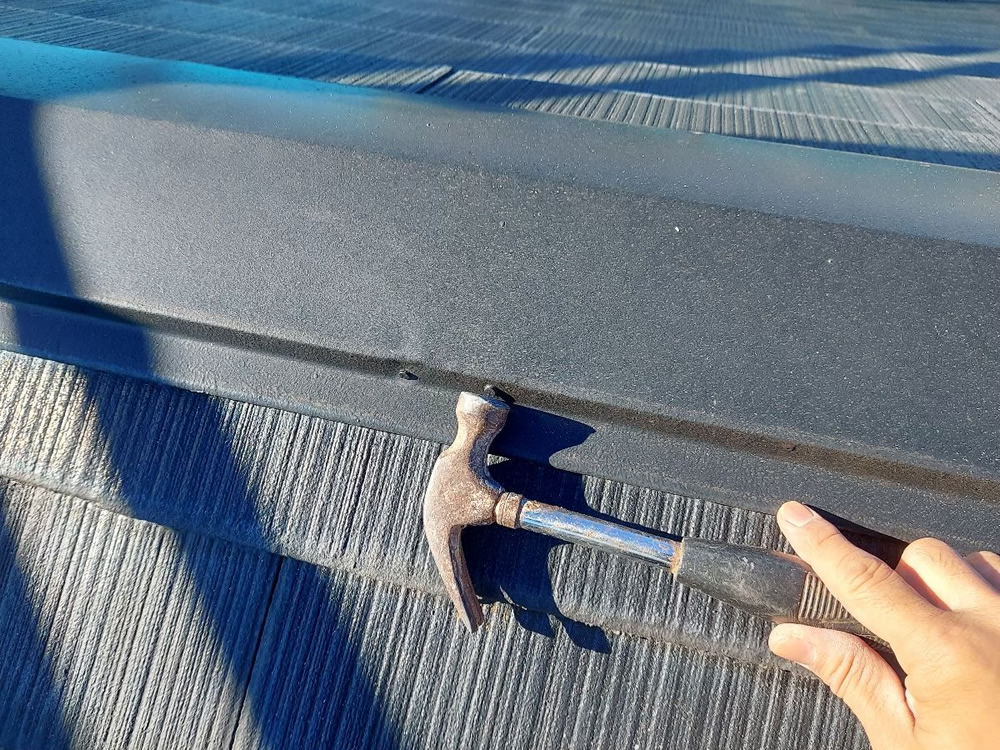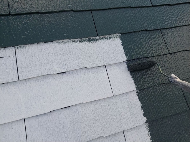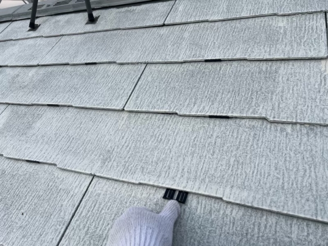 POINT05 縁切り ポイント5以前の塗装3工程を行うと、瓦が塗膜でくっついてしまい、瓦と瓦の間にゴミが入ったような状態になってしまいます。すると、雨が降った時、雨水を吸って腐敗の原因になります。 それを防ぐため、スレート瓦の重なり部分を切る縁切り作業を行います。最後にカッターで切り隙間を確保します。既存の状態で隙間があればタスペーサーという器具を差し込んでから塗装を行います。