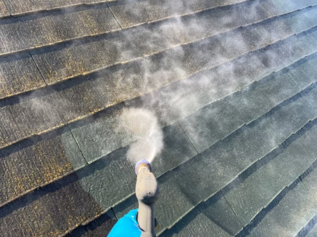 POINT01 高圧洗浄 最も基本となるのが屋根の下地処理です。外壁と比べて過酷な環境にさらされているため、表面の塗膜は、年数が経つにつれどんどん傷んでいきます。そのため、高圧洗浄を丁寧に行い、表面の塗膜をキレイにする事で新たな塗装がより長持ちすることに繋がります。