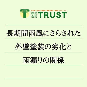 | 長期間雨風にさらされた外壁塗装の劣化と雨漏りの関係 ◆防水効果が低下した外壁塗装の状態とは? 住宅は長期間紫外線や雨風にさらされることで外壁が劣化し、雨漏りなどのトラブルが発生しやすくなるため注意が必要です。 以下の状態に当てはまる時は、外壁塗装の防水効果が低下している恐れがあります。 自宅の外壁をチェックしてみましょう。 ・外壁の隙間を埋めるシーリング剤が固くなり、縮みやひび割れが見られる ・外壁の塗装が剥がれてきている ・外壁に大きめ(0.3mm以上)のひび割れ(クラック)が見られる ・外壁に手で触れた時、白い粉がつく これらの症状が見られる時は、外壁の防水効果の低下から雨漏りなどのトラブルが発生しやすい状態になっていると言えます その他にもシロアリやカビ、ダニの発生といったトラブルが起きる恐れもあるため、早めにプロの業者に相談するようにしましょう。 ◆塗料によって耐用年数は異なる 外壁に使用される塗料の種類やグレードによって、防水性が保てる耐用年数は異なります。 以下に、おおよその耐用年数について塗料の種類ごとにまとめました。 ・アクリル系塗料:4~7年 ・ウレタン系塗料:6~10年 ・シリコン系塗料:8~15年 ・フッ素系塗料:15~20年 ・無機系塗料:15~20年 これらは目安となる耐用年数ですが、この期間を過ぎている場合、雨漏りなどのトラブルが起きる可能性が高まるため注意しましょう。 特にアクリル系塗料などは他の塗料と比較して耐用年数が短いため、塗料の塗り直しの頻度が増えることを覚えておいてください。 ◆定期的な外壁塗装で外壁を風雨や紫外線から守ろう 住宅の外壁の表面が劣化すると、雨が降った際に水が浸み込んで壁材や天井裏などに雨水が溜まり、腐食が進んでしまいます。 こうした事態を防ぐためにも、定期的な外壁塗装が必要となります。 外壁塗装は雨風や紫外線などから外壁を守り、雨漏りなどの発生で住宅の寿命を縮めるトラブルを防ぐ重要な役割があるのです。 また、塗装に用いられる樹脂は、種類によって耐用年数が異なります。 例えばシリコン樹脂はウレタン樹脂よりも耐用年数が長いため、塗装時にコストはかかりますが、耐用年数が長くお得です。 他にも様々なタイプの塗料が開発されているため、塗装する業者と相談のうえ、住宅の外壁に合わせた最適な塗料で外壁塗装を行うと良いでしょう。 ◆外壁・屋根塗装の相談はTRUSTへ さいたま市、所沢市、飯能市、入間市などで外壁塗装について相談したい方はTRUSTへご連絡ください。 住宅の構造や立地条件、機構などを考慮したうえで、最適な塗料を用いて長く住宅を守れる外壁塗装を実施いたします。 |