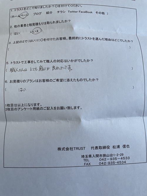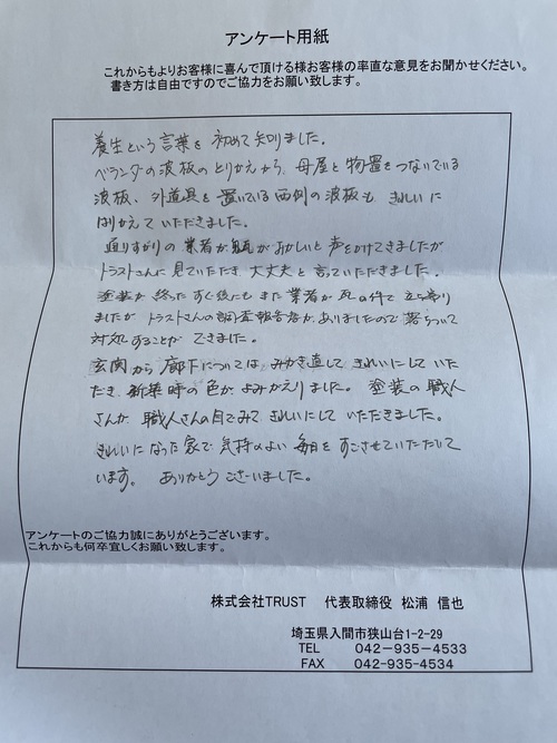 | 養生という言葉を初めて知りました。ベランダの波板のとりかえから、母屋と物置をつないでる波板、外道具を置いている西側の波板もきれいにはりかえていただきました。通りすがりの業者が鬼瓦がおかしいと声をかけてきましたがトラストさんに見て頂き大丈夫と言っていただきました。 塗装が終わったすぐ後にも、また業者が瓦の件で立ち寄りましたが、トラストさんの調査報告書がありましたので落ち着いて対処することができました。 玄関から廊下については、みがき直してきれいにして頂き新築時の色がよみがえりました。塗装の職人さんが、職人さんの目でみてきれいにしていただきました。きれいになった家で気持ちのよい毎日をすごさせていただいています。ありがとうございました。 M様 この度は弊社TRUSTを選んで頂き有難うございました。 追加でご依頼頂いた床塗装は、弊社職人も満足の仕上がりが出来喜んでおりました。また、一年点検でお伺いいたします。 |