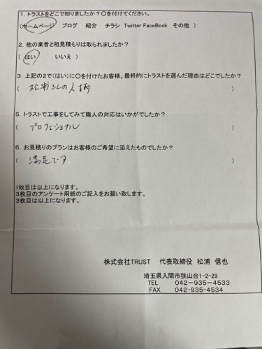 | 仕事にスピード感あり 専門的な話を分かりやすく説明 メリット・デメリットが明確に分かるように説明 特に下請けから独立して「自分で事業する」が感動した。 人柄が、来る工事の人にも反映している? (あたり前だが、工事前の挨拶と終了の挨拶) 進捗もポイントで連絡あり(安心感) 今後も頑張ってください。 弊社より↓↓↓↓↓ この度は数ある業者の中から弊社を選んで頂き有り難う御座います。 作業中はたくさんのお気遣いをして頂き有り難う御座いました。 お陰様で作業もスムーズに終える事が出来ました! 完工後もお褒めのお言葉をたくさん頂けて、もっと頑張ろうと思えました! 貴重なご意見有り難う御座いました。 今後とも弊社TRUSTを宜しくお願い致します。 また、一年点検でお伺いさせて頂きます。 |