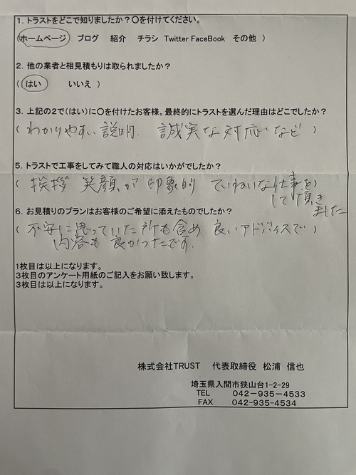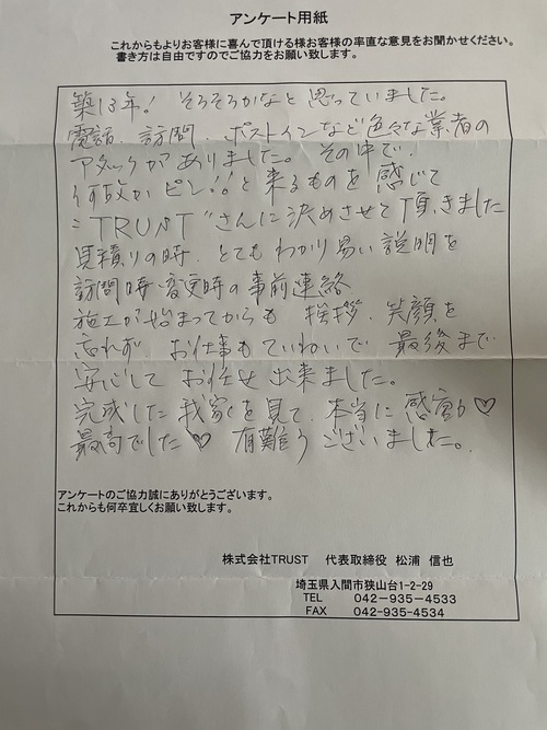 | 築13年!そろそろかなと思っていました。 電話・訪問・ポストインなど色々な業者のアタックがありました。 その中で、何故かピン!!と来るものを感じてTRUSTさんに決めさせて頂きました。見積もりの時、とてもわかり易い説明を訪問時・変更時の事前連絡、施工が始まってからも挨拶・笑顔を忘れず、お仕事も丁寧で最後まで安心してお任せ出来ました。完成した我が家を見て本当に感動・最高でした!有り難う御座いました。 弊社より↓↓↓↓↓ この度は数ある業者の中から弊社を選んで頂き有り難う御座います。 作業中はたくさんのお気遣いをして頂き有り難う御座いました。 お陰様で作業もスムーズに終える事が出来ました! アンケートでお褒めのお言葉、大変嬉しいです! 貴重なご意見有り難う御座いました。 今後とも弊社TRUSTを宜しくお願い致します。 また、一年点検でお伺いさせて頂きます。 |