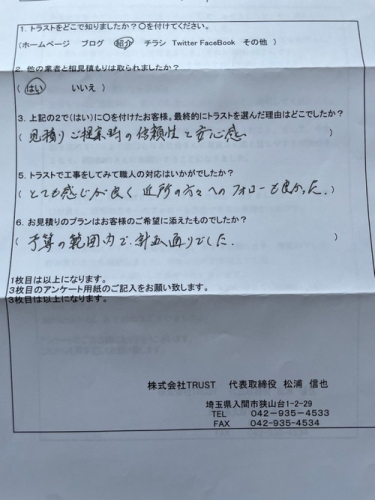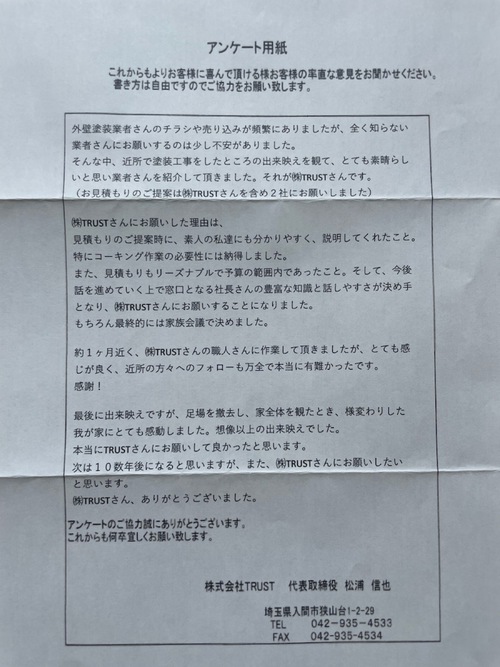 | 外壁塗装業者さんのチラシや売込みが頻繁にありましたが、全く知らない業者さんにお願いするのは少し不安がありました。 そんな中、近所で塗装工事をしたところの出来栄えを観て、とても素晴らしいと思い業者さんを紹介して頂きました。それが㈱TRUSTさんです。 (お見積もりのご提案は㈱TRUSTさんを含め2社にお願いしました) ㈱TRUSTさんにお願いした理由は、見積りのご提案時に素人の私達にも分かりやすく、説明してくれたこと。 特にコーキング作業の必要性には納得しました。 また、見積りもリーズナブルで予算の範囲内であったこと。 そして今後、話を進めていく上で窓口となる社長さんの豊富な知識と話しやすさが決め手となり、㈱TRUSTさんにお願いすることになりました。 もちろん最終的に家族会議で決めました。 約1ヶ月近く、㈱TRUSTさんの職人さんに作業して頂きましたが、とても感じが良く、近所の方々へのフォローも万全で本当に有難かったです。 感謝! 最後に出来栄えですが、足場を撤去し、家全体を観たとき、様変わりした我が家にとても感動しました。想像以上の出来栄えでした。 本当にTRUSTさんにお願いして良かったと思います。 次は10数年後になると思いますが、また㈱TRUSTさんにお願いしたいと思います。 ㈱TRUSTさん、ありがとうございました。 弊社より↓↓↓↓↓ この度は数ある業者の中から弊社を選んで頂き有り難う御座います。 作業中はたくさんのお気遣いをして頂き有り難う御座いました。 お陰様で作業もスムーズに終える事が出来ました! 色分けの箇所など決めるお打ち合わせで沢山時間を使って頂き有難うございました! アンケートでお褒めのお言葉、大変嬉しいです! 貴重なご意見有り難う御座いました。 今後とも弊社TRUSTを宜しくお願い致します。 また、一年点検でお伺いさせて頂きます。 |