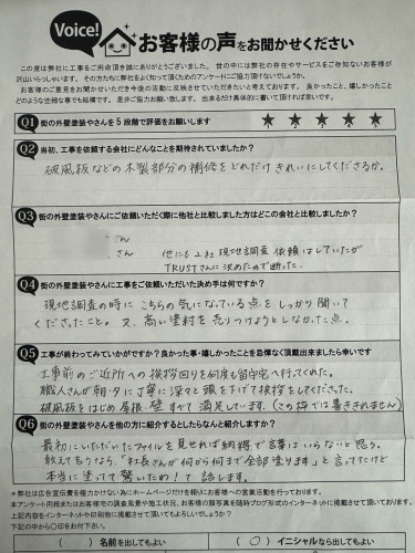 この度は弊社を選んで頂きありがとうございました!また、一年点検でお伺いさせて頂きます! TRUSTでは無料で建物点検・御見積を承っておりますので、お気軽にお問合せください! |