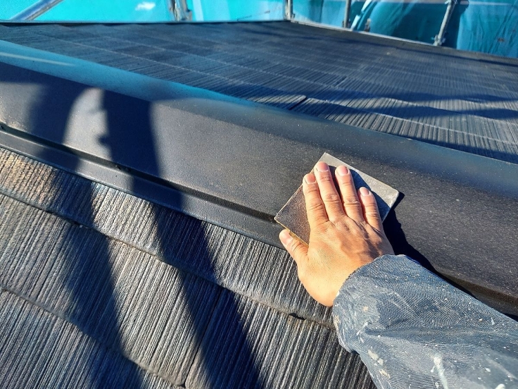 | 棟鈑金のケレンをしていきます。鈑金部は表面が固く平らなので、塗装が剥がれやすい為ペーパー等で細かい傷を付けて塗料の密着を良くします。 | ||||||||||||