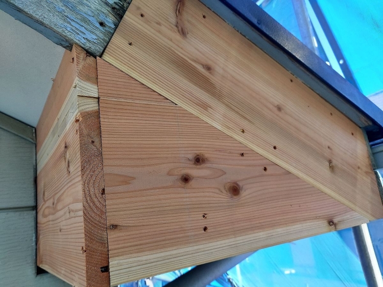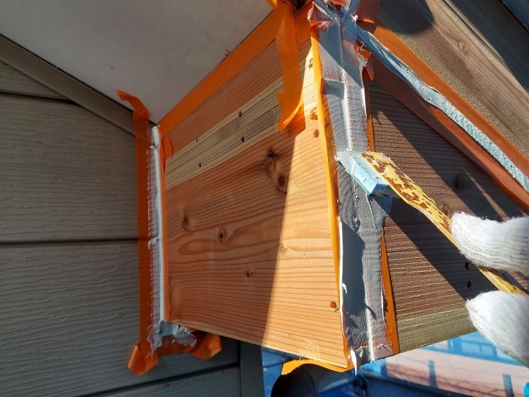 | 新規で付けた破風板の繋ぎ目をコーキングで塞いでいきます。 | ||||||||||||