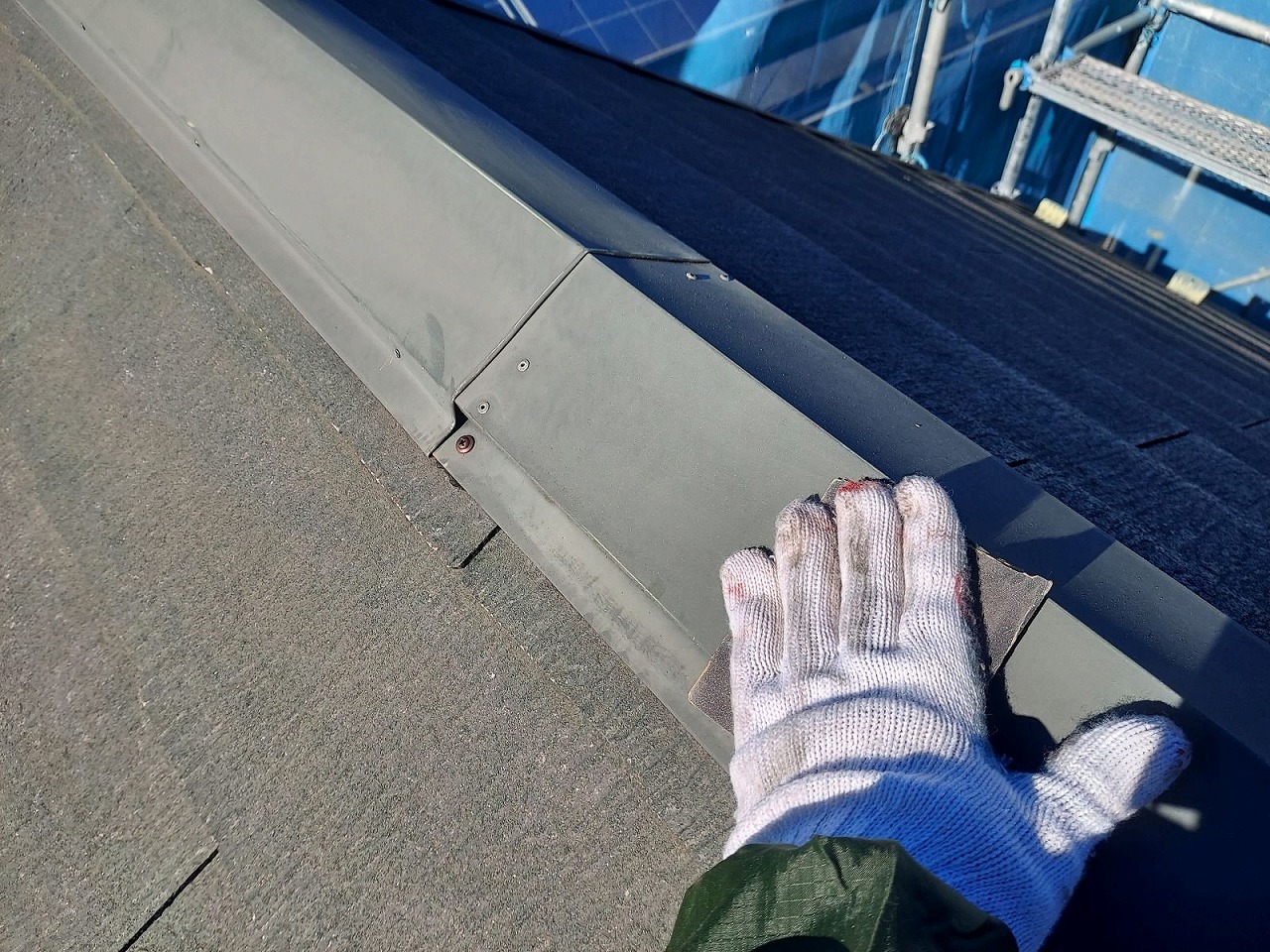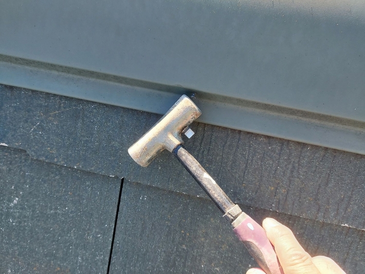 | 年数が経つと棟鈑金の釘が緩んできてしまいます。台風などで外れてりしない様に釘の締め直しを行います。 | ||||||||||||