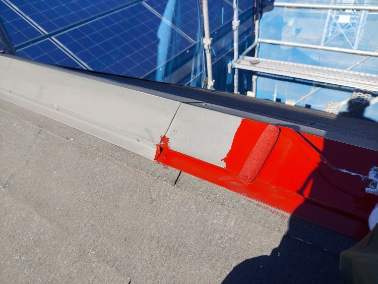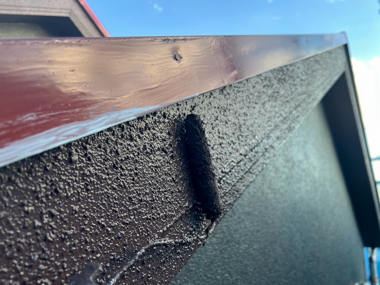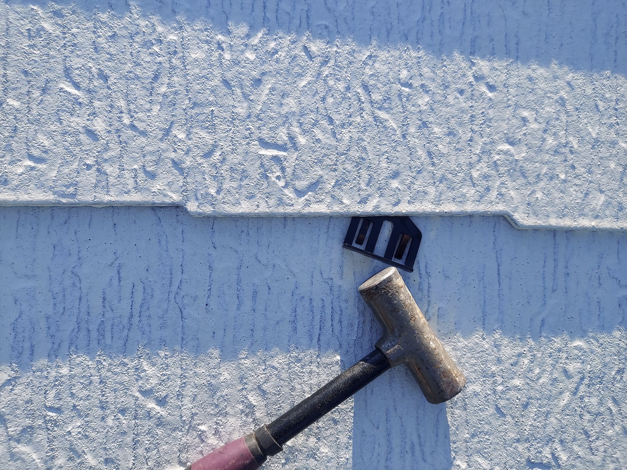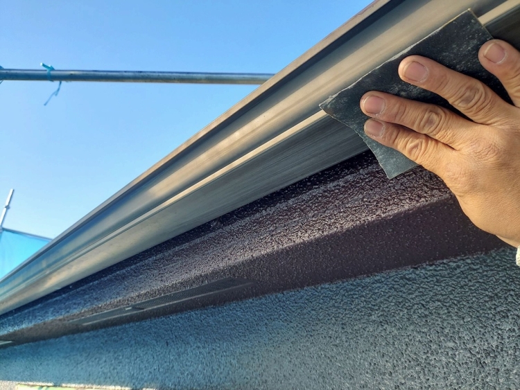 タスペーサーを差し込みます。 屋根の重なりが塗料で埋まってしまうと、水の抜け道がなくなり雨漏れの原因になってしまいます。 そこを縁切りする為に、タスペーサーと言う器具を差し込んでいきます。 |