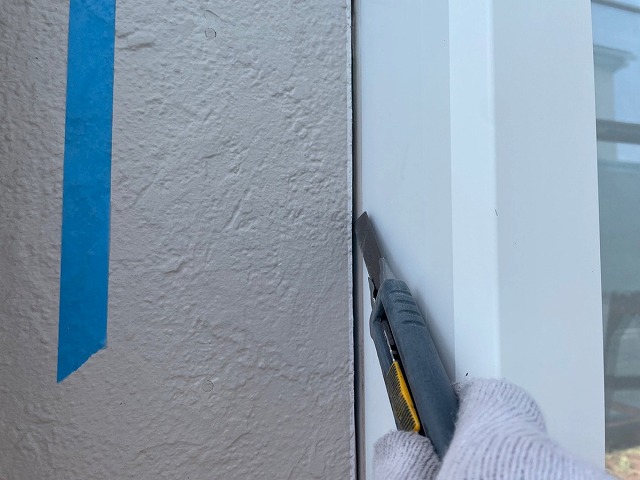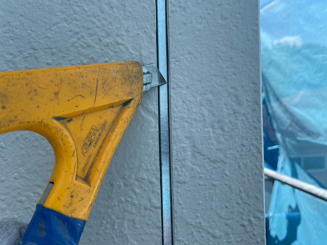 ①既存のコーキングを撤去していきます。 窓周りは構わずにカッターを入れてしまうと、中の防水シートを切ってしまい雨漏れの原因になってしまうので、撤去のやり方を少し工夫して取っています! 最近の業者さんは『窓周りは雨漏れの原因になるから撤去はせずに増し打ちで行います!』と説明してる所が多いみたいですが、増し打ちは古いコーキングの上に新しいのを薄く付けるだけなので絶対ダメです❌ |