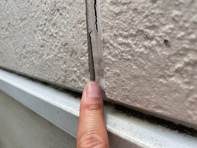 | ②コーキングは全体的に割れが多く見えました。コーキングが割れても直ぐに雨漏れする心配はないのですが、サイディングの断面から水を吸って基材を傷めてしまいます。 | ||||||||||||
