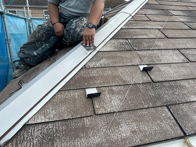 ⑥タスペーサーを差し込みます。 屋根の重なりが塗料で埋まってしまうと、水の抜け道がなくなり雨漏れの原因になってしまいます。 そこを縁切りする為に、タスペーサーと言う器具を差し込んでいきます! |