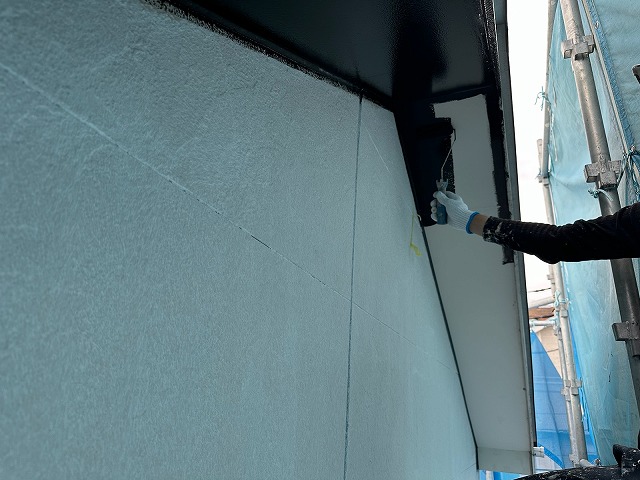 | ②上塗り2回目を塗っていきます。軒天は溶剤塗料を使用しているので計2回塗りです。状態や仕様によっては3回塗りになります。 | ||||||||||||