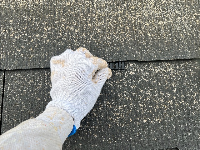 縁切りと言われる作業! タスペーサーを差し込みスレート材を持ち上げて隙間を作ります。差し込まずに塗装をすると塗料で隙間が埋まり雨漏れの原因になってしまいます。 タスペーサーは差し込んだらそのまま塗装するので、屋根にはずっと残る器具になります! |