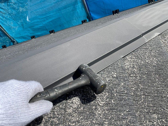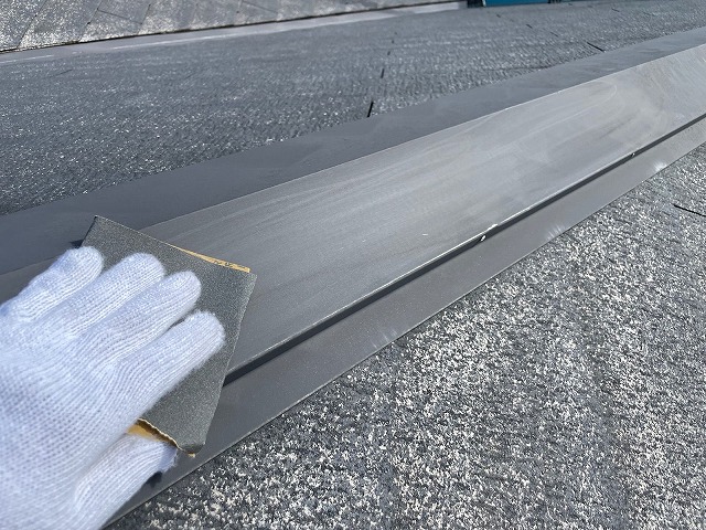 | 棟板金をペーパーなどでケレンをし、塗料の密着がしやすい下地を作っていきます。 | ||||||||||||