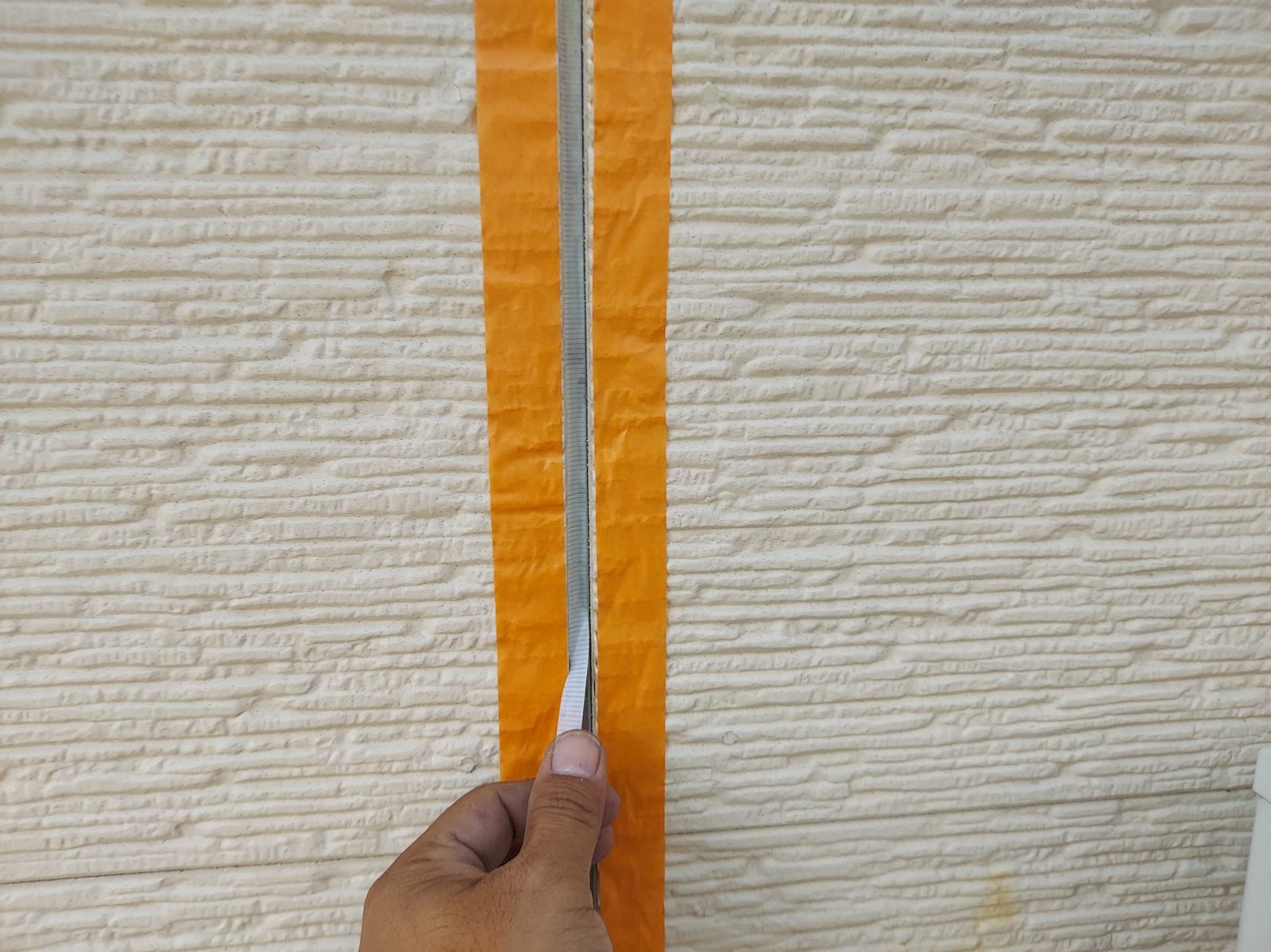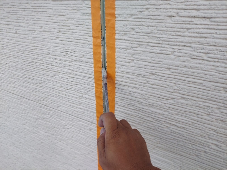 | ③3面接着防止テープを目地突き当り部に貼っていきます。サイディング目地は2面接着でなければいけません。理由などはショールームにて模型でご説明しております(^^)/ | ||||||||||||
