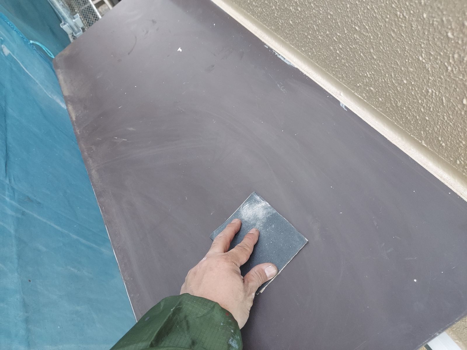 | ③棟板金をペーパーなどでケレンをし、塗料の密着がしやすい下地を作っていきます。 | ||||||||||||