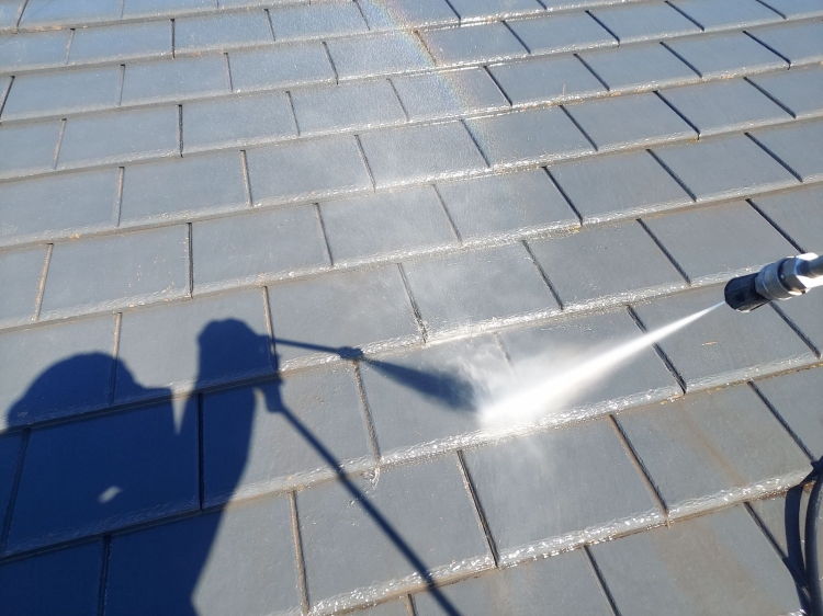 | ①屋根の表面のコケや藻、古くなった塗膜を高圧洗浄機で落としていきます。 | ||||||||||||