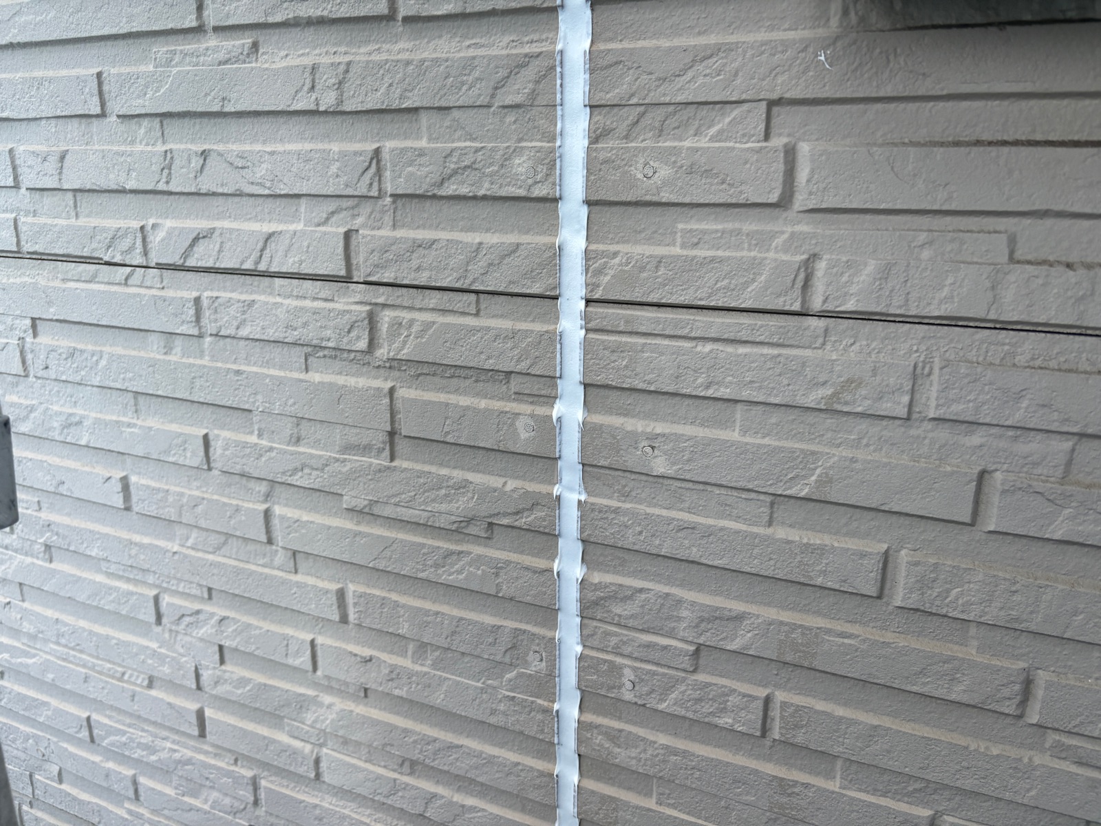 ➁サイディング目地は接着する面が両脇の2面でないといけせん。建物は動くのでコーキング引っ張られて割れない様に両脇2面のみの接着です! 突き当たり部には接着しない様にボンドブレーカー(三面接着防止テープ)を貼ります。 |