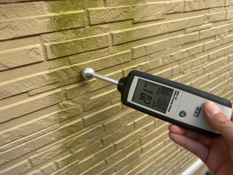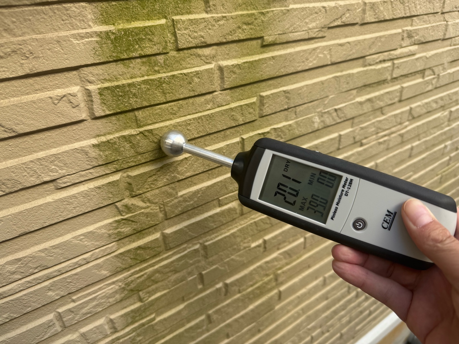 | ②サイディング水分含有率を測りました。20%〜30%が塗り替えのタイミングで30%〜40%は少し水分が多いので早めに塗り替えをしないといけないサインです。写真の場所はコケの部分ですが、表面のコケなので高圧洗浄でしっかり落とせば塗装に支障はありません。 | ||||||||||||