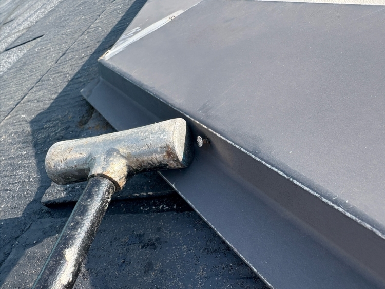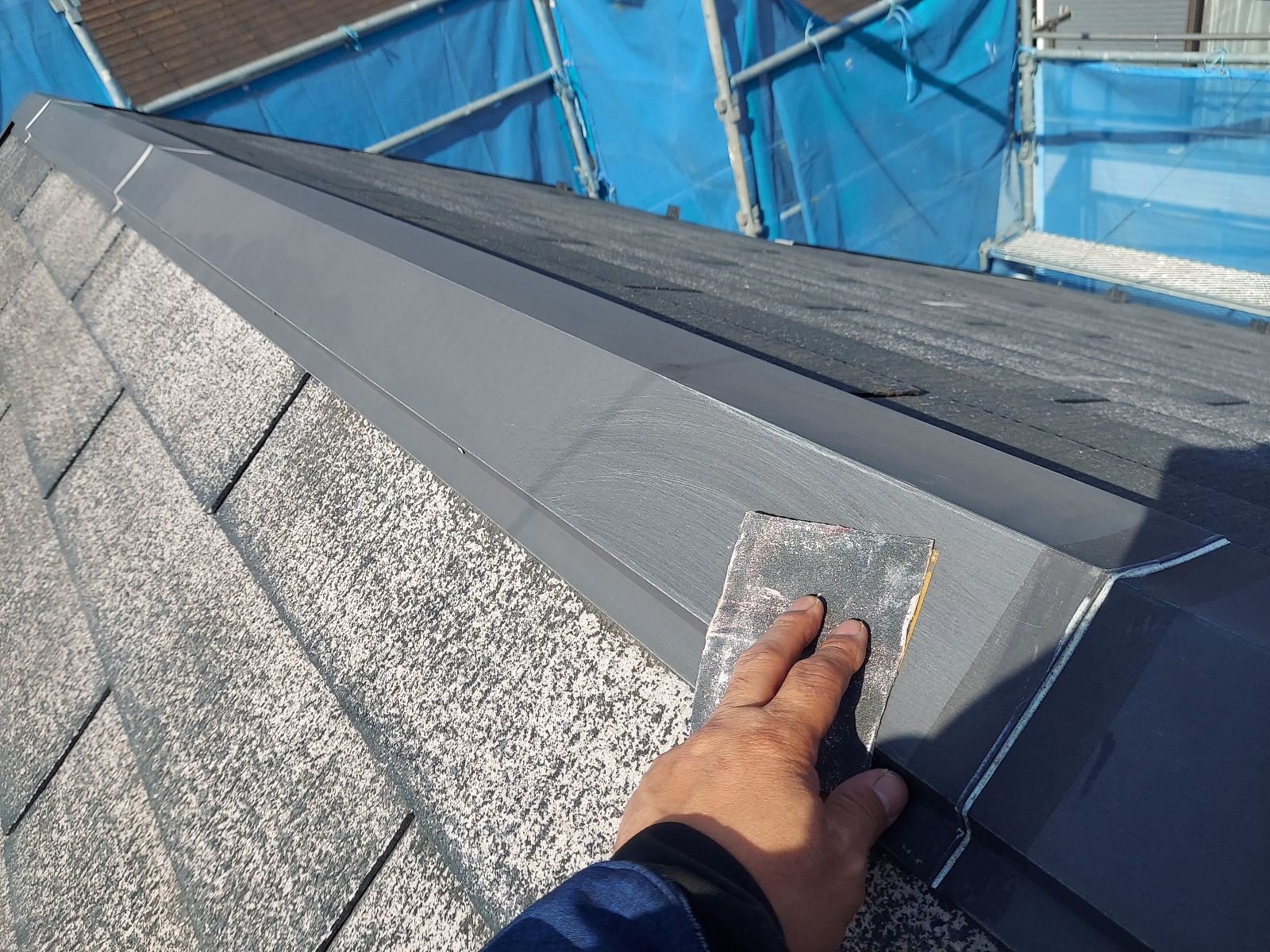 ③棟板金をペーパーなどでケレンをし、塗料の密着がしやすい下地を作っていきます。 |