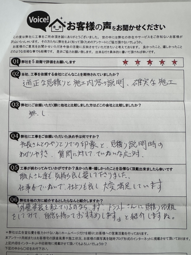 弊社より↓↓↓↓▼ A. 『外壁塗装を考えているのなら、まずトラストさんに見積もり依頼をしてみて、自信を持っておすすめします』と紹介しますね。K様、この度は数ある業者の中から弊社を選んで頂き有難うございました。工事中、職人へのお茶など沢山のお気遣いありがとうございます。 今後とも、弊社トラストを宜しくお願い致します。 また、一年点検でお伺いさせて頂きます。 |
