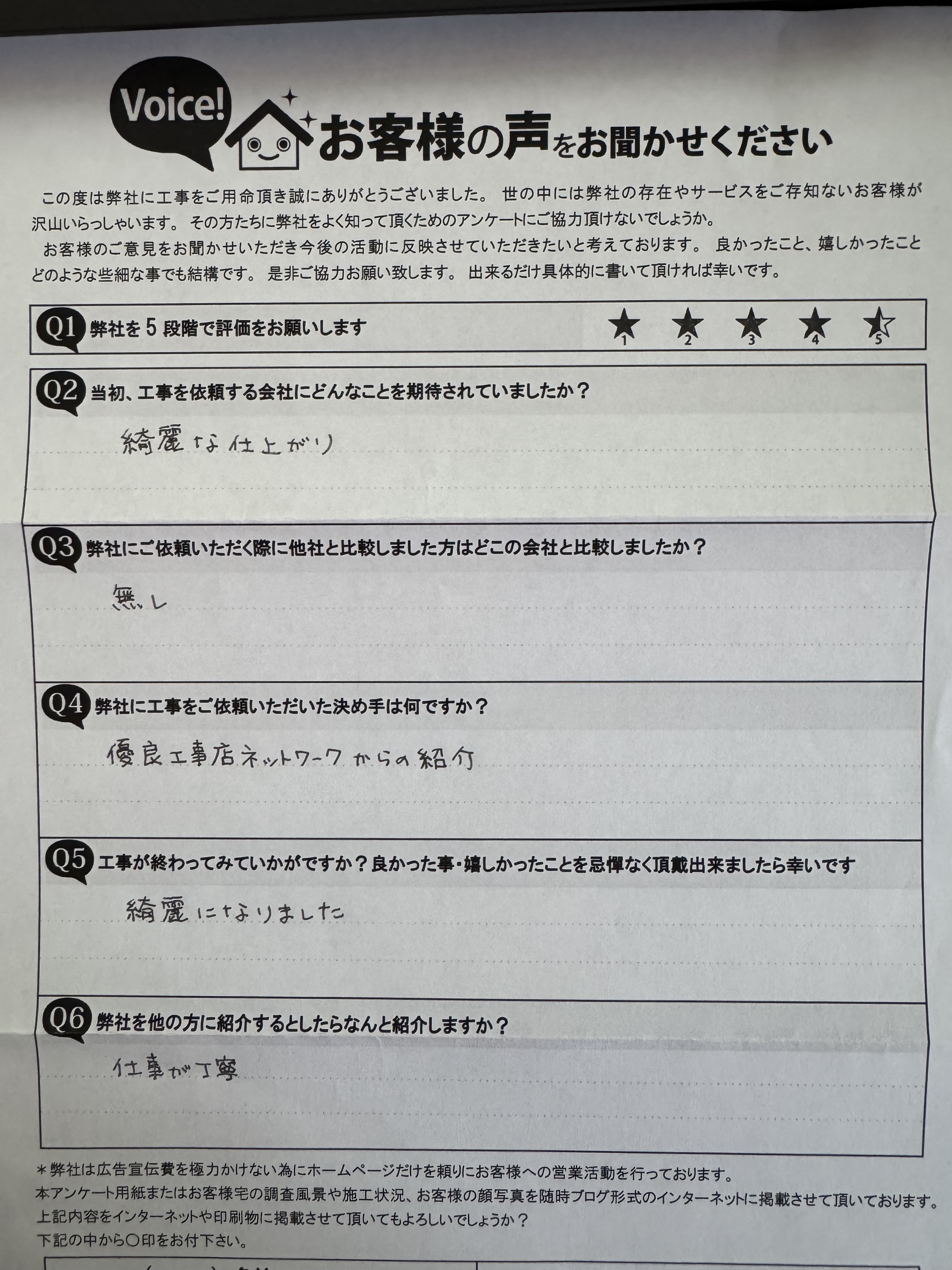弊社より↓↓↓↓▼ A. 仕事が丁寧S様、この度は数ある業者の中から弊社を選んで頂き有難うございました。 工事中は色々お気遣いを頂きスムーズに作業を行うことが出来ました!アンケートでも嬉しいご意見ありがとうございます! 今後とも、弊社トラストを宜しくお願い致します。 また、一年点検でお伺いさせて頂きます。 |