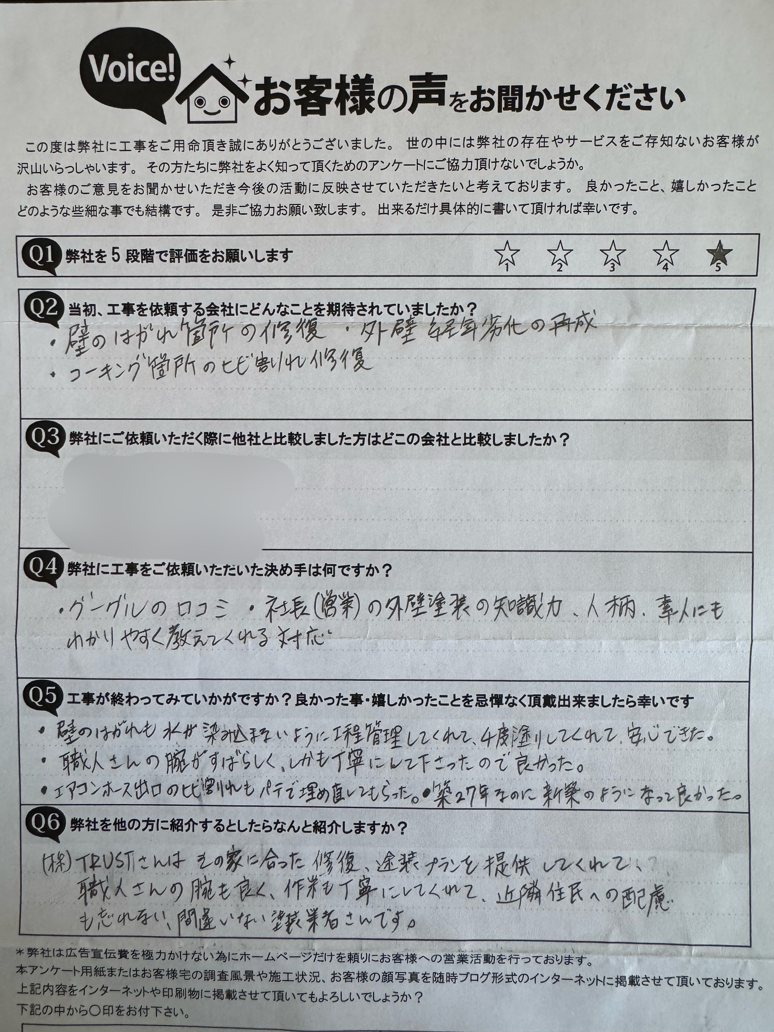 弊社より↓↓↓↓▼ A. ㈱TRUSTさんはその家に合った修復・塗装プランを提供してくれて、職人さんの腕も良く作業も丁寧にしてくれて、近隣住民への配慮も忘れない、間違いのない塗装業者さんです。T様、数ある業者の中から弊社を選んでいただきありがとうございます。工事に伴いご連絡対応などご協力していただいたおかげで作業がスムーズに出来ました!今後とも、弊社トラストを宜しくお願い致します。 また、一年点検でお伺いさせて頂きます。 |