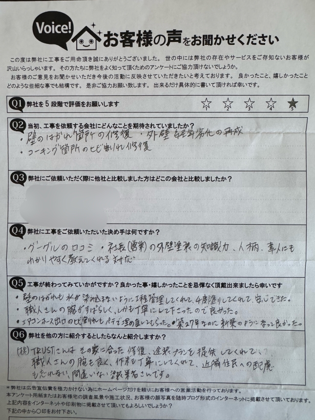▼ A. ・壁の剝れも水が染み込まないように工程管理してくれて、4度塗りしてくれて安心できた。・職人さんの腕がすばらしく、しかも丁寧にして下さったので良かった。 ・エアコンホース出口のヒビ割れもパテで埋め直してもらった。 ・築27年なのに新築のようになって良かった。 Q6. 弊社を他の方に紹介するとしたらなんと紹介しますか?