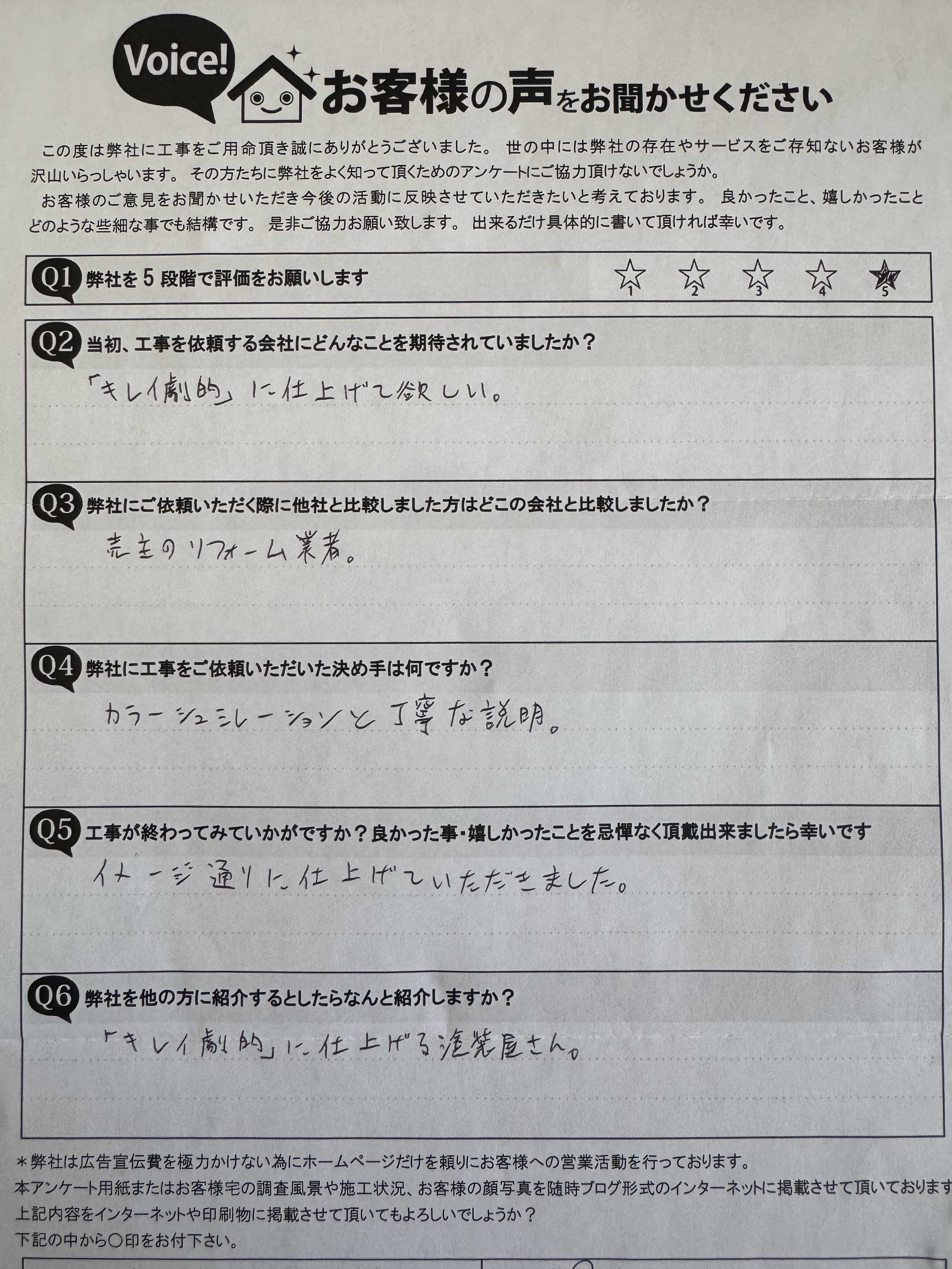 弊社より↓↓↓↓▼ A. 「キレイ劇的」に仕上げる塗装やさん。S様、この度は数ある業者の中から弊社を選んで頂き有難うございました。 工事中はお車の移動などお気遣いを頂きスムーズに作業を行うことが出来ました!施工も色もイメージ通りと気に入って頂けて良かったです☆アンケートでも嬉しいご意見ありがとうございます! 今後とも、弊社トラストを宜しくお願い致します。 また、一年点検でお伺いさせて頂きます。 |