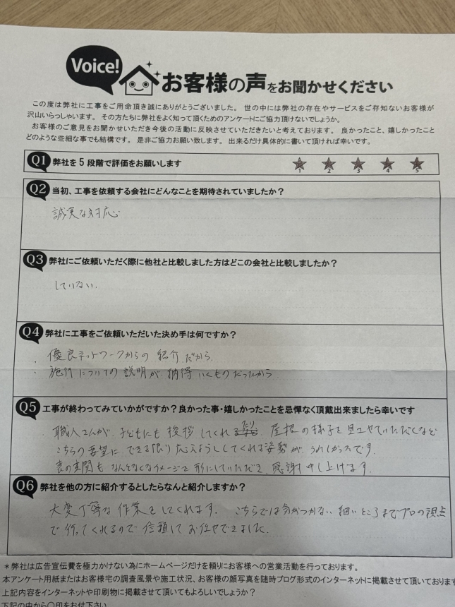 弊社より↓↓↓↓▼ A. 大変丁寧な作業をしてくれます。こちらでは気がつかない細かい所までプロの視点で行ってくれるので信頼してお任せできました。M様、この度は数ある業者の中から弊社を選んで頂き有難うございました。 工事中はお車の移動などお気遣いを頂きスムーズに作業を行うことが出来ました!玄関のアクセント(ダブルトーン)もご満足いただけて良かったです☆アンケートでも嬉しいご意見ありがとうございます! 今後とも、弊社トラストを宜しくお願い致します。 また、一年点検でお伺いさせて頂きます。 |