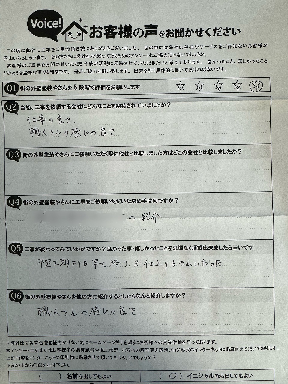 ▼ A. 予定工期よりも早く終わり、又仕上がりも綺麗だった。Q6. 弊社を他の方に紹介するとしたらなんと紹介しますか?