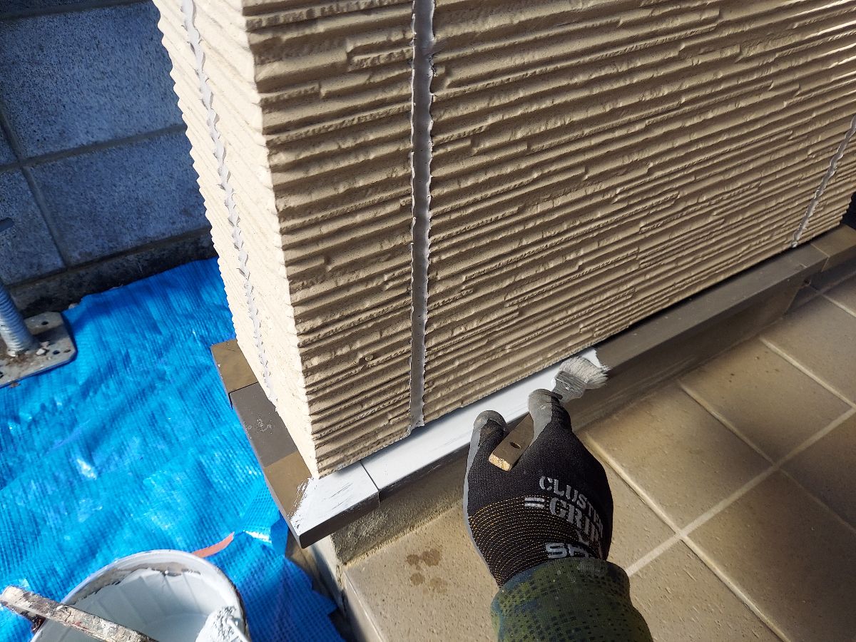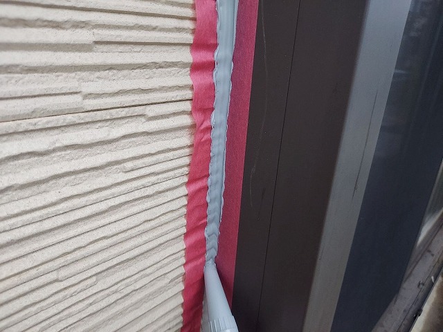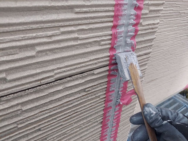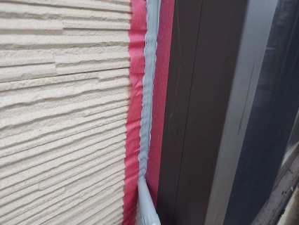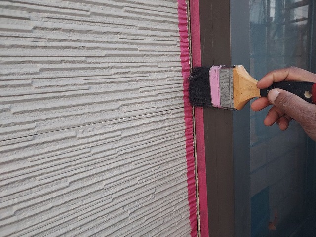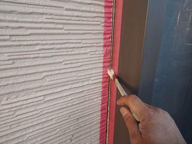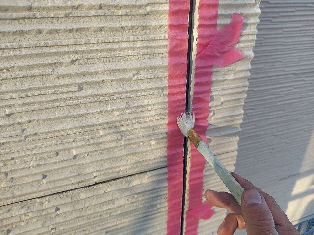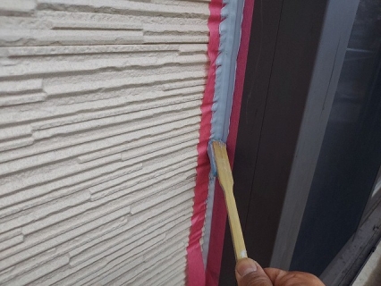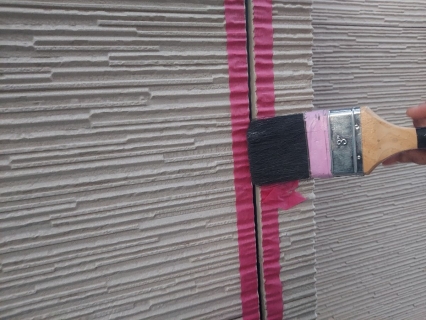 | コーキングの密着性を高めるプライマーを塗っていきます。 |