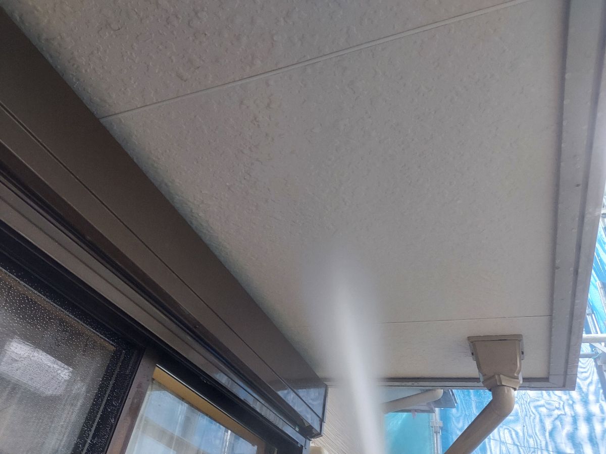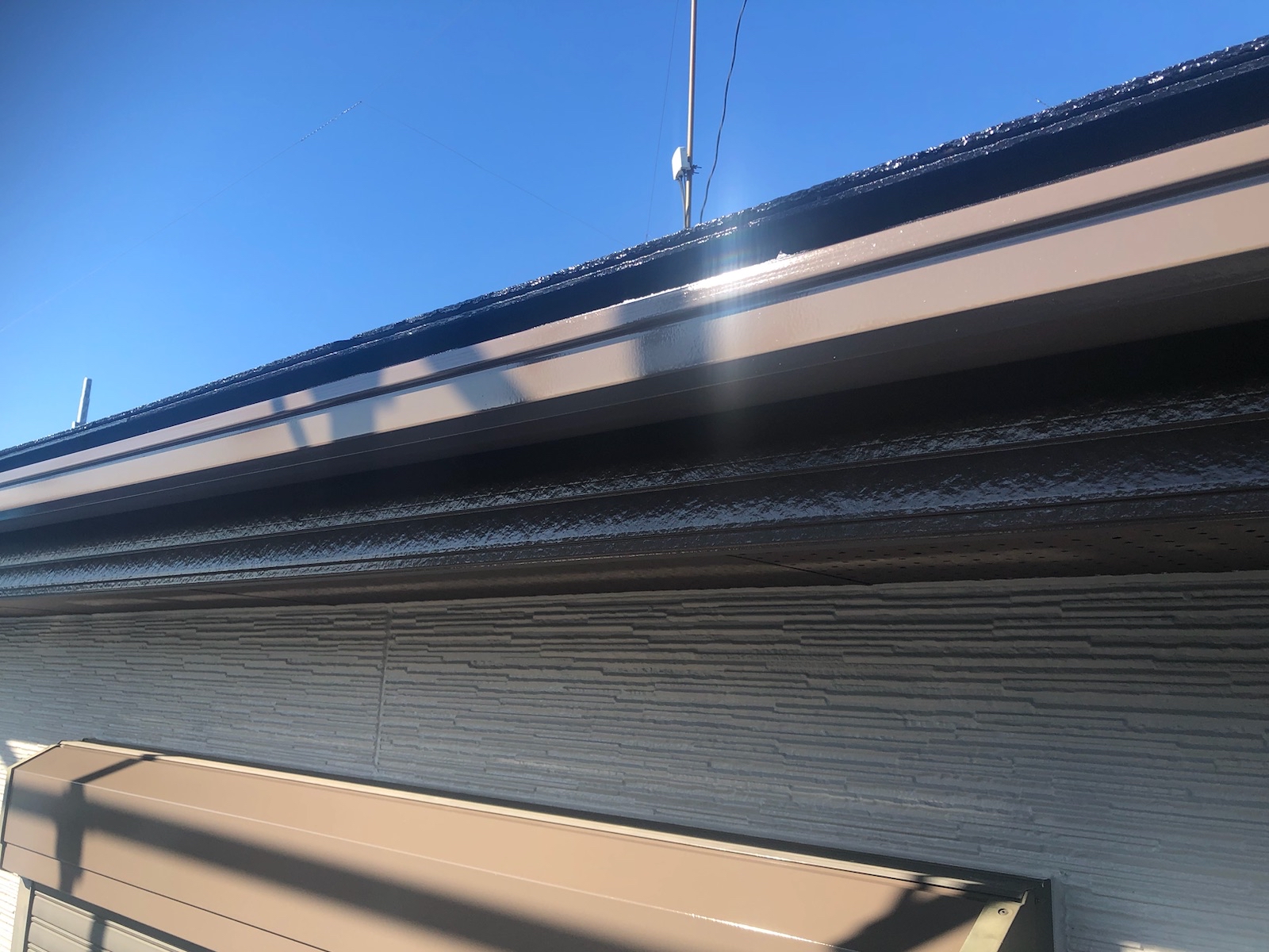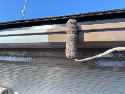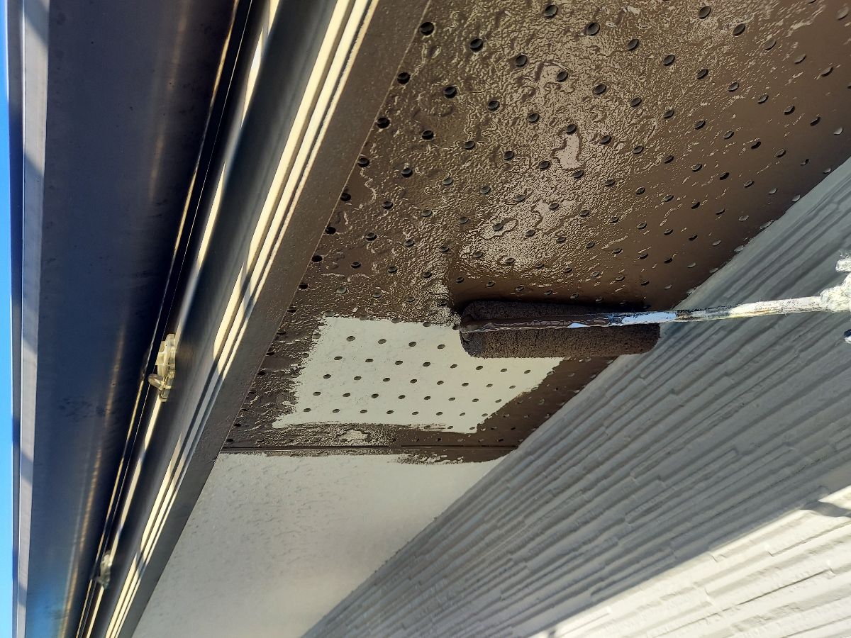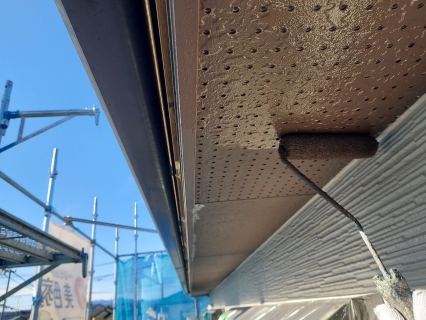 中塗りを塗っていきます。 お客様のご要望で外壁の色はそんな変えたくないけど、どこかでアクセントが欲しい!と相談されたので軒天をちゃいろにして、少し和の感じをご提案しました。 |