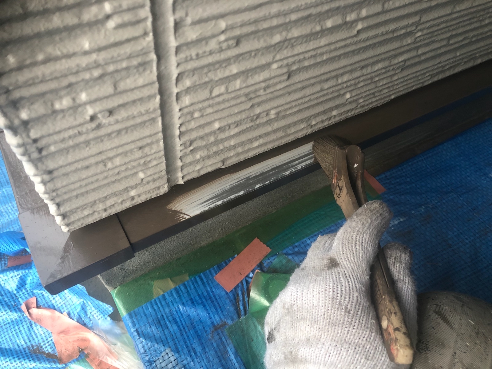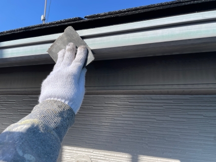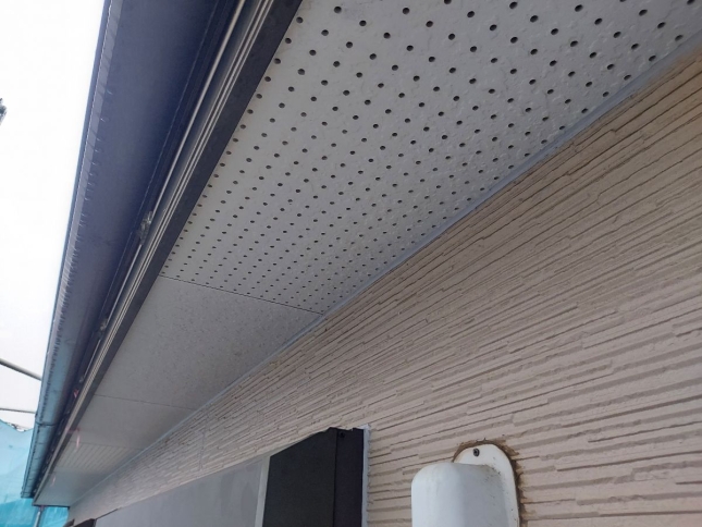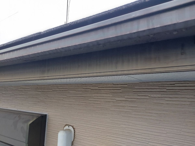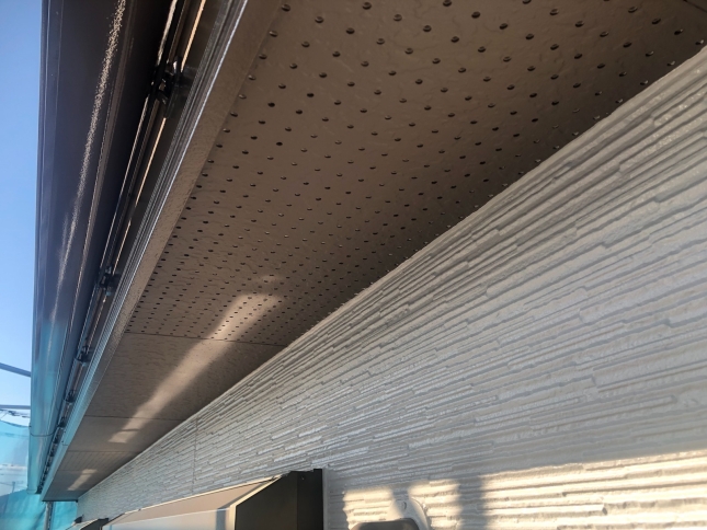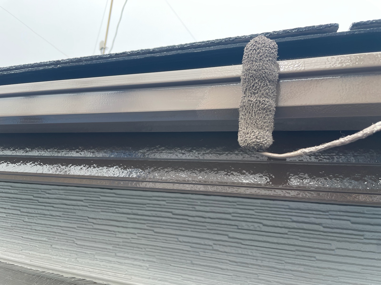 中塗りを塗っていきます。 お客様のご要望で外壁の色はそんな変えたくないけど、どこかでアクセントが欲しい!と相談されたので軒天をちゃいろにして、少し和の感じをご提案しました。 |