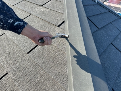 屋根材の重なり部が塗料で埋まってしまうと雨漏れの原因になってしまうので、隙間が出来る様に器具を差し込みます。 タスペーサーは一回目の塗り替え時に必ず差し込む必要があります! |