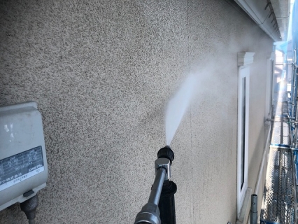 | 高圧洗浄をしていきます。壁の素材がリシン仕上げで苔汚れが多いので、しっかり洗っていきます。 |