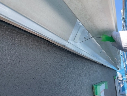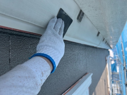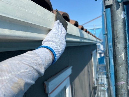 破風板のケレン作業をしていきます。 板金タイプの破風板なので素材は硬くペーパー等で傷を付けて塗料の足がかりを作る事で密着性を高めます。 |