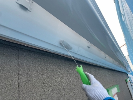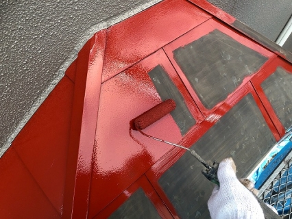 | 中塗りを塗っていきます。先の重なりなどの細かい部分を刷毛で塗ってからローラーで塗っていきます。 |