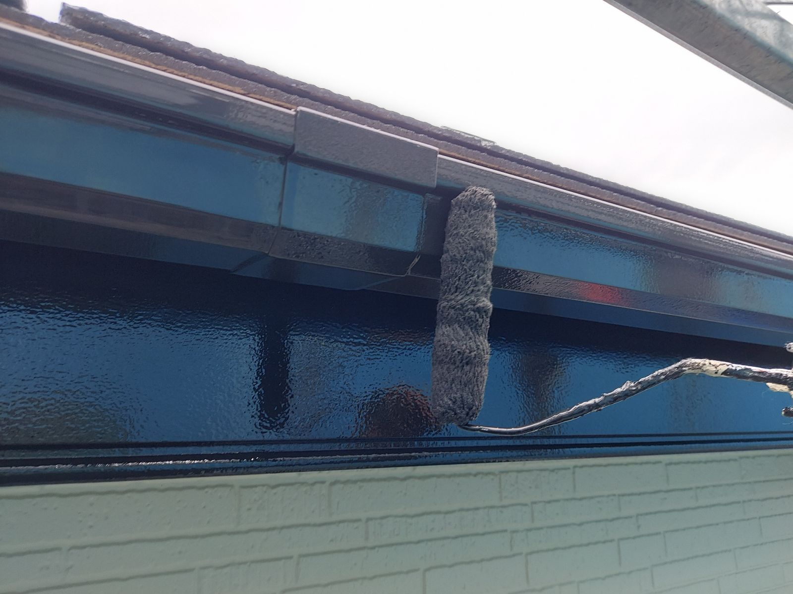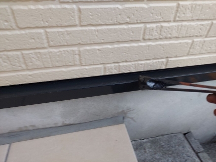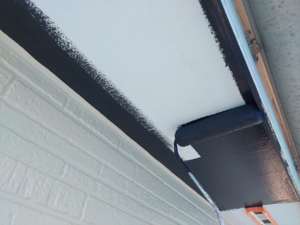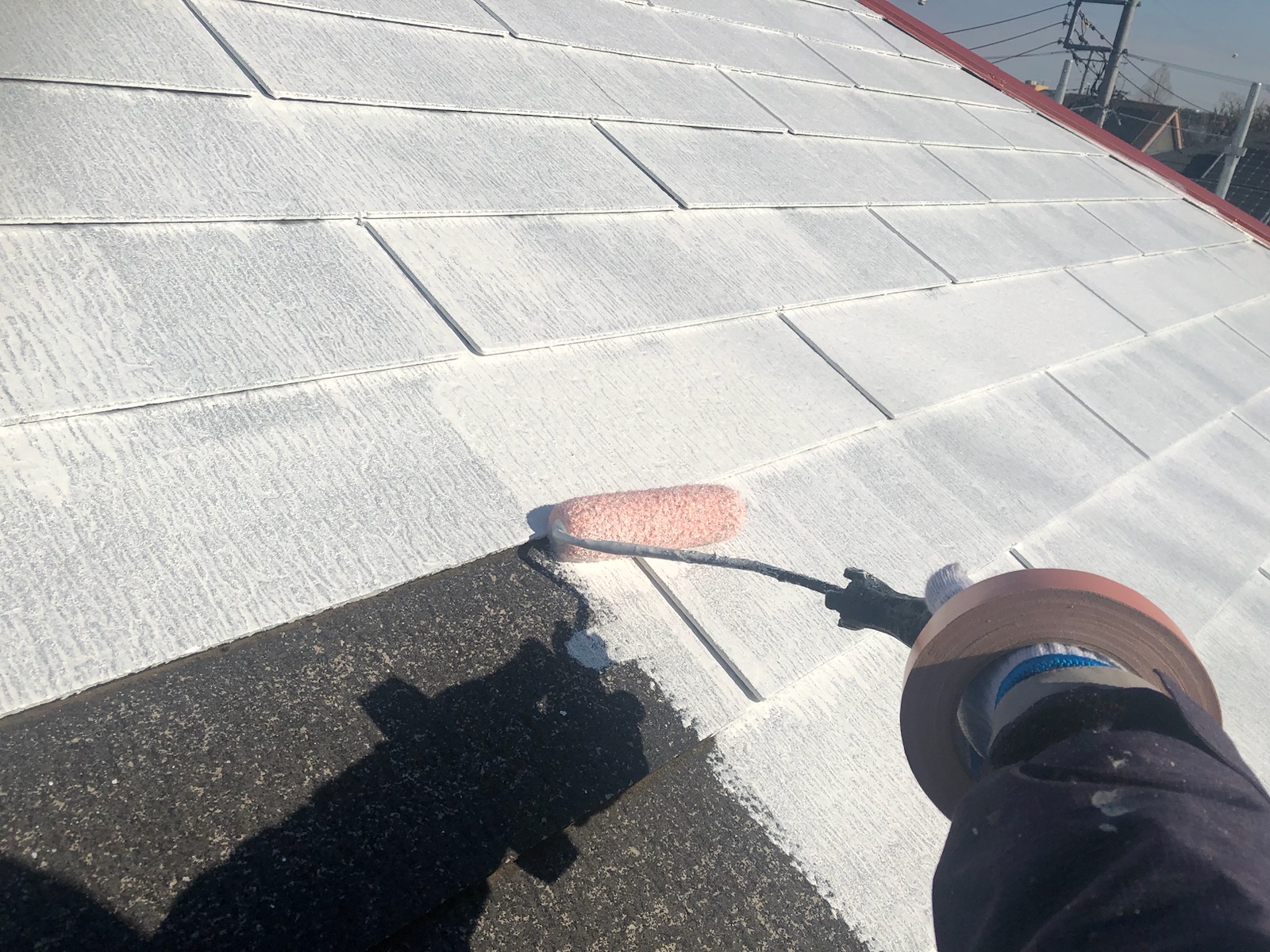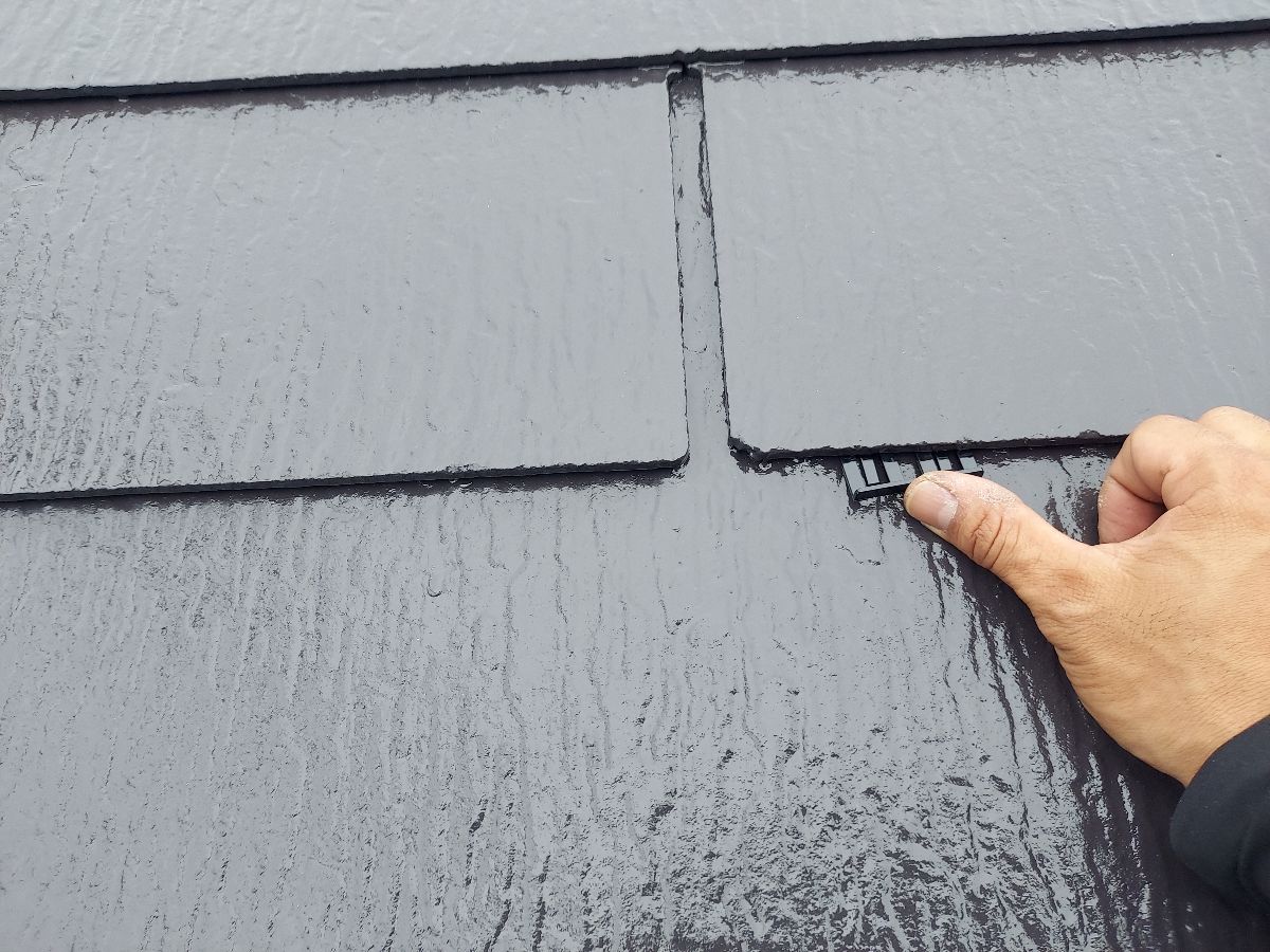 タスペーサーを差し込みます。 屋根の重なりが塗料で埋まってしまうと、水の抜け道がなくなり雨漏れの原因になってしまいます。 そこを縁切りする為に、タスペーサーと言う器具を差し込んでいきます!