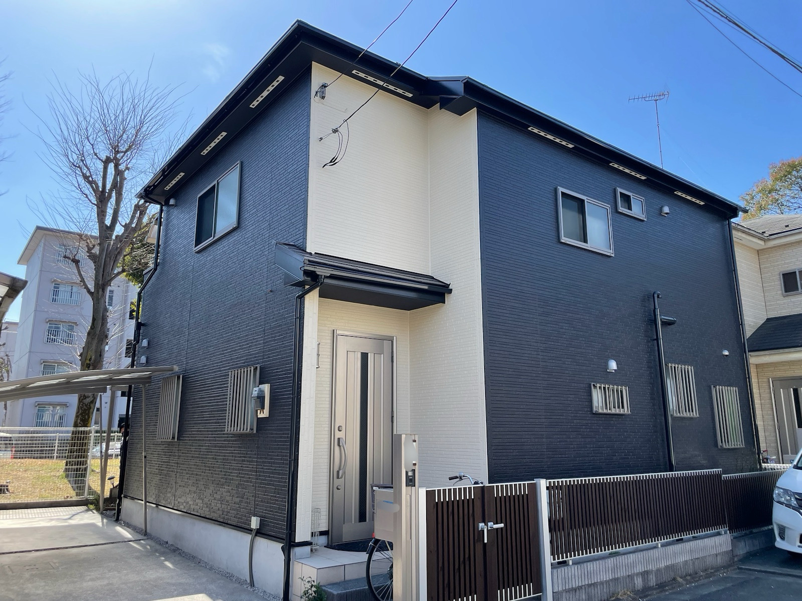 外壁塗料メーカー:アステックペイント 使用塗料:フッソREVO1000-IR メイン色:8079 アクセント色:8093 |