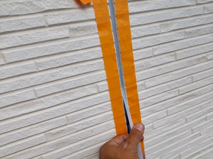 ボンドブレーカーとは? サイディングのシーリングは突き当りに接着させない2面接着でなければいけません! 3面全てに接着してしまうとシーリング・サイディングが割れる原因になりますので、接着防止テープを貼っていきます。 |