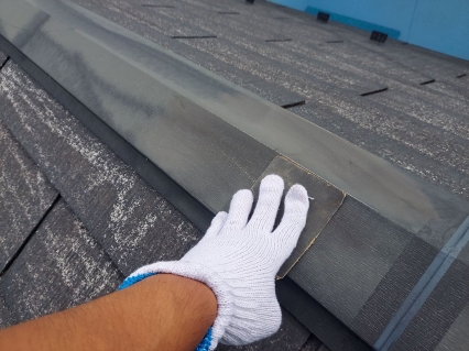 | ②棟鈑金は素材が固く下地の処理をしないと塗料の密着が悪い為、ペーパー等で擦り密着のしやすい下地を作っていきます。 |