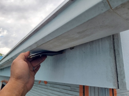 ⑤タスペーサーを差し込みます。 屋根の重なりが塗料で埋まってしまうと、水の抜け道がなくなり雨漏れの原因になってしまいます。 そこを縁切りする為に、タスペーサーと言う器具を差し込んで通気を確保していきます!
