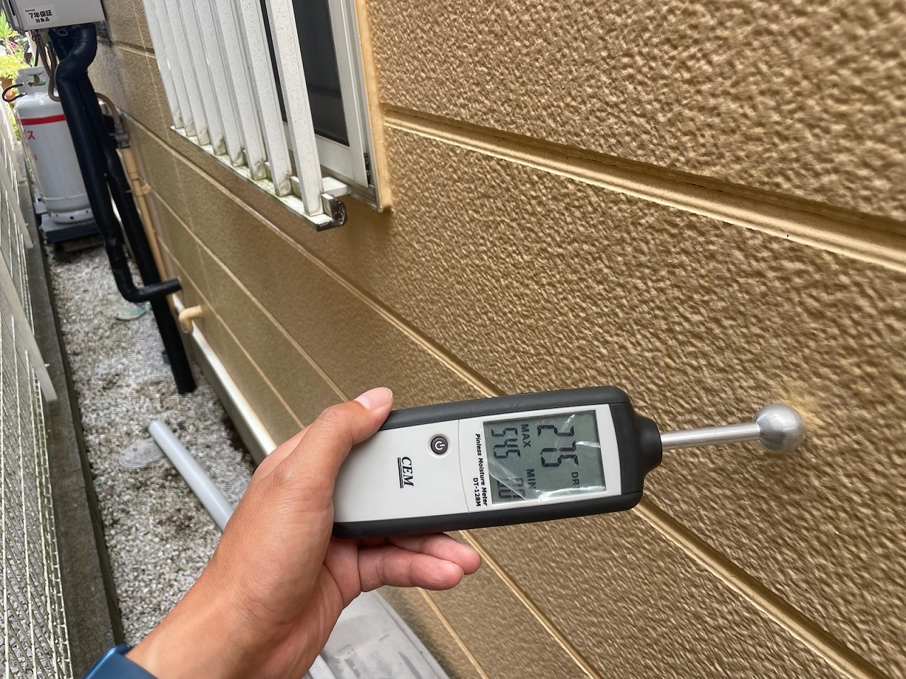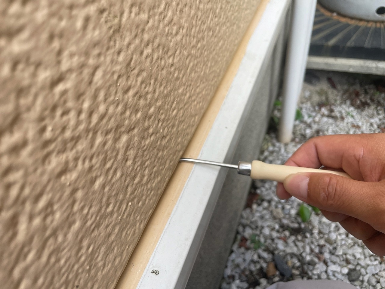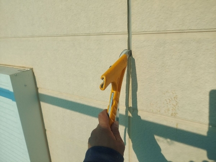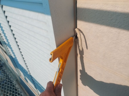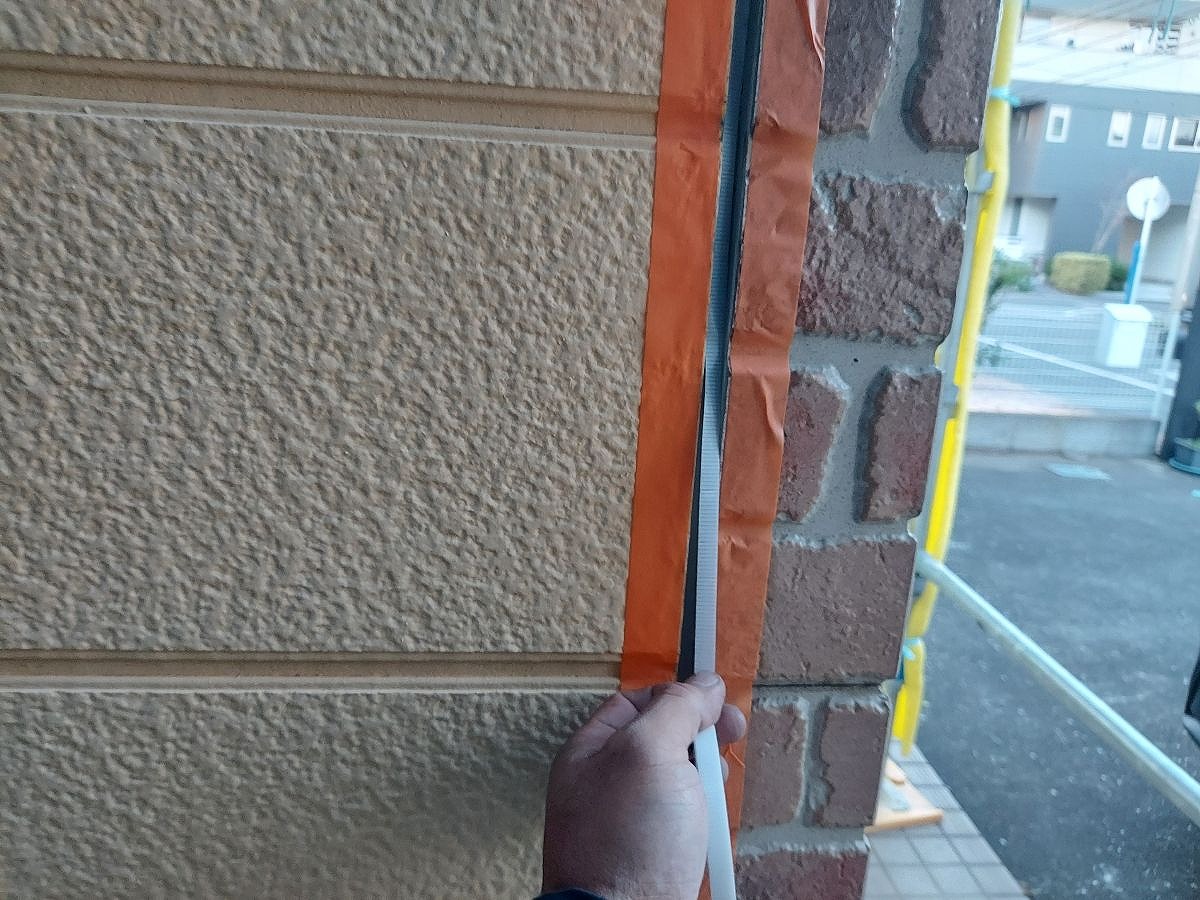 | サイディング下地通気の隙間をチェックします!通気幅が狭い構造の場合は、塗料を考えて選定しないと壁内部の湿気が抜けずに膨らんでしまいますので、大事な確認作業です! |