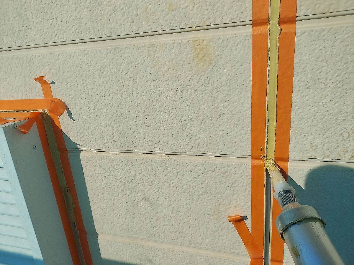 ボンドブレーカーテープとは? 木造住宅は地震以外にも建物は小さく動いているので、サイディング・シーリングも動きに合わせなくてはいけません。 なので、サイディング両側のみ密着させてテープを貼っている突き当り部分には密着しない様に、表面が加工されたボンドブレーカーテープを貼ります! |
