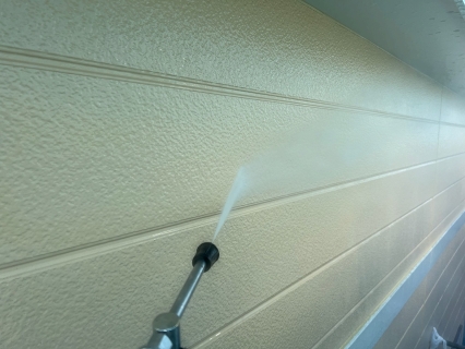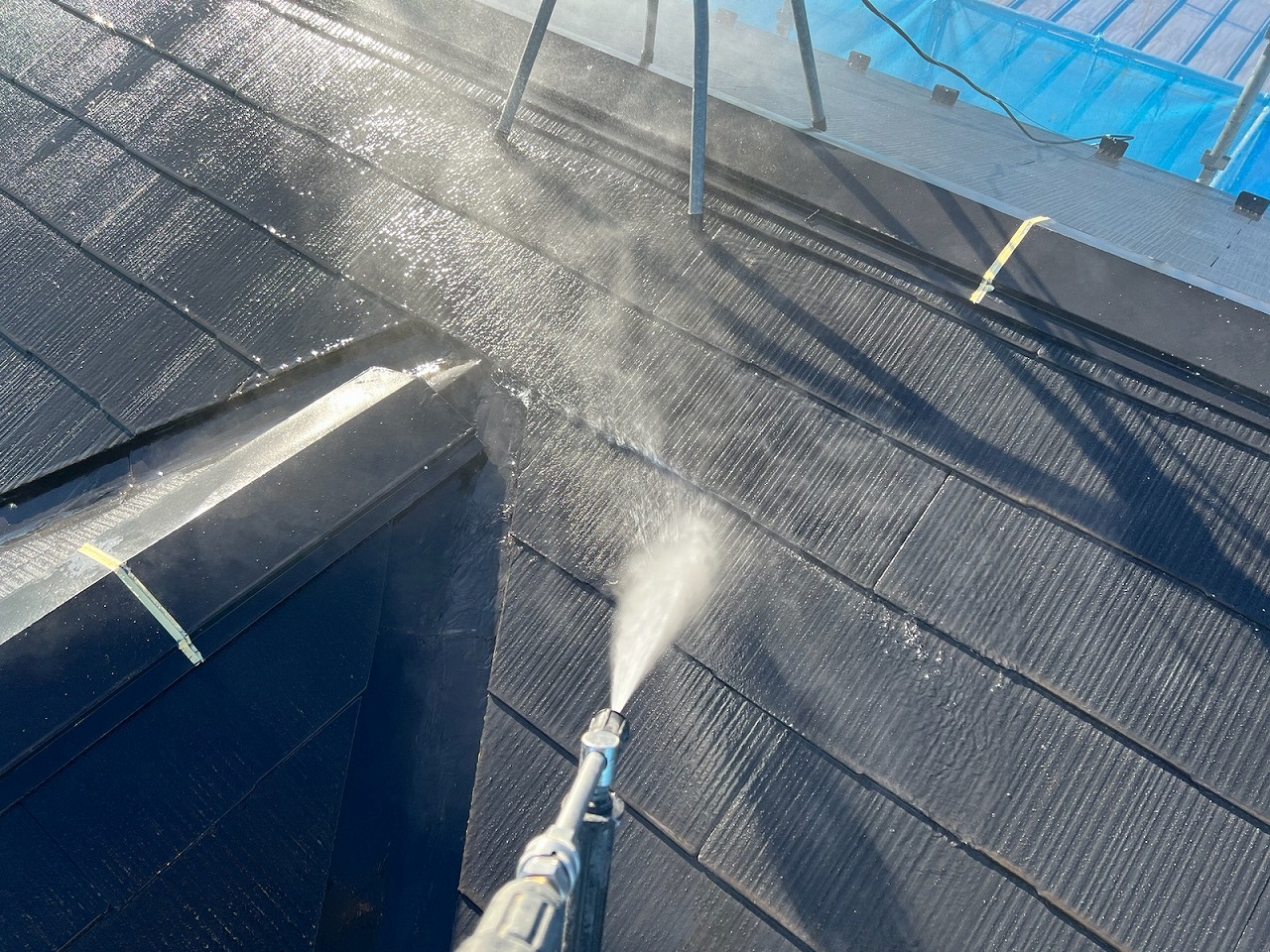 ①高圧洗浄をしっかりしていきます! ホコリ・苔が残っていると、どんなに良い塗料を塗っても意味がありません! |